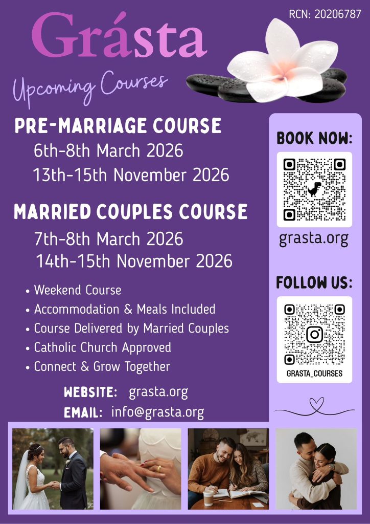 In Ireland pre-marriage courses are organised in every diocese by Accord, the Catholic Marriage Care Service. Information on courses in the Imeall Boirne Pastoral Area can be obtained from the Parish Office.